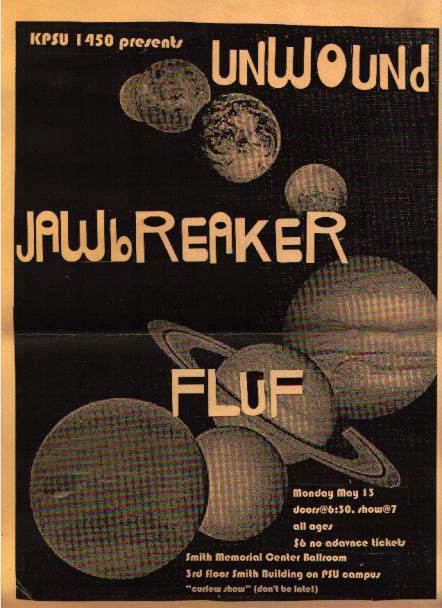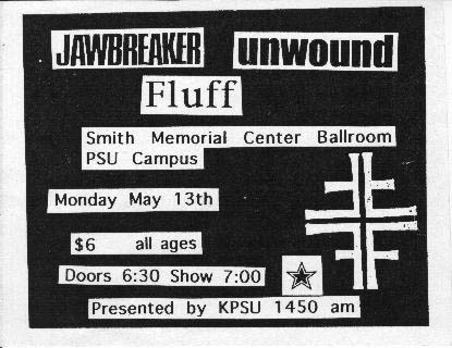 Also on the bill was Unwound and Fluf. I grabbed a set list at the end of the show, written on the back of a package of GHS TNT guitar strings... Great show, good crowd, the new songs really stood out. The set list seems to suggest that Blake wasn't sure about playing For Esme, but they did play it, it was awesome. This was one of their last shows, and for me was a great way to say good-bye. I remember standing outside before the show smoking and makeing chit-chat with Blake and Chris. This was also my first introduction to Unwound, also one of my favorite bands. I have two different fliers for this show, both are on the Complete Jawbreaker Page, but the flier on the show list is completely new to me.