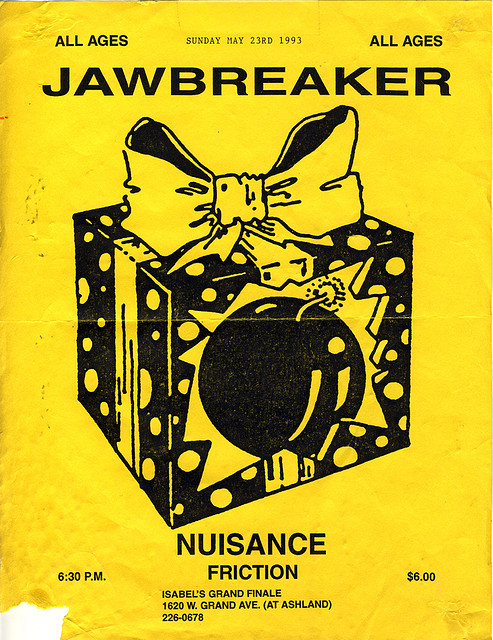 A decent show which took place while the band was in town recording 24 Hour Revenge Therapy with Steve Albini; in fact, according to Blake, they were slated to finish recording the album on the very next day. The video begins with a shot of the band setting up and listening to the venue's background music for a good five minutes. The place is extremely small and cramped, and to make matters worse, there's an eight-year-old girl up front. Consequently, a V.M.L. security guy stands onstage for most of the show. Blake's explanations of the songs are amusing. Chesterfield King is "an irresponsible song that romanticizes a bad habit," while Boxcar is three things: a love song, a song about shitty things people do to each other in the punk scene, and an homage to trains. The Boat Dreams From the Hill is identical to the 20 Mar. 1993 version. The last two songs make up the encore; Blake seems somewhat reluctant to continue playing, but tells the crowd that he'll oblige them if someone hooks him up with valium, since he's been having trouble sleeping. After Caroline, Blake tells the crowd that that was the last time the song would be played on the tour (not true!). Towards the end of the show, Blake tells the crowd to go to the Born Against and Los Crudos show on the 29th.