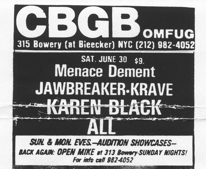 Jawbreaker's first CBGB show circa 1990. This is the listing from the Village Voice, edited here for clarity. We played with my sister's band The Voluptuous Horror of Karen Black and All. Strange bill?