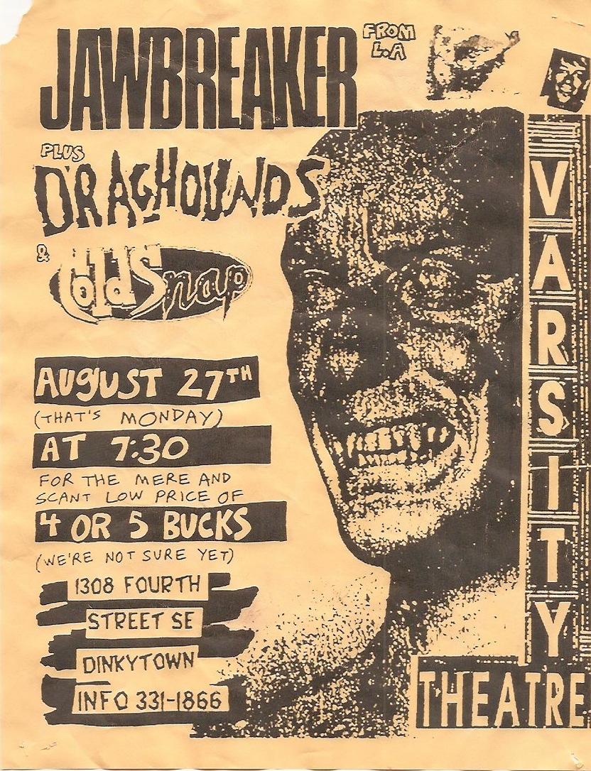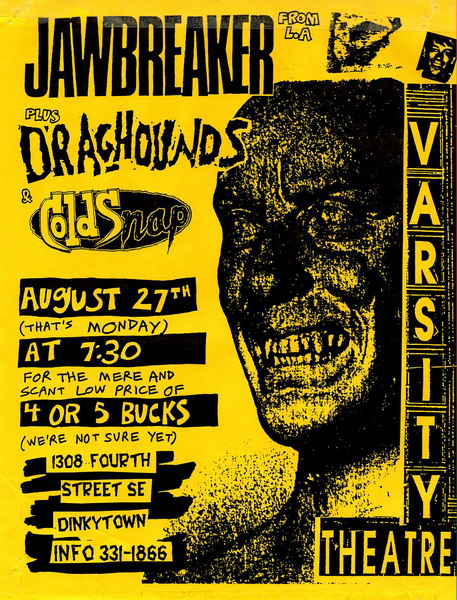 The drive from Edmonton to the border took six hours. The guard didn't ID on the way out but rather chose to get into his coveralls and toss the van with a fine tooth comb. It was getting dark when he finally let us go. We sped off and almost ran over a cow crossing the highway on a lonely stretch of northeast Montana. We took three hour shifts in zero visibility and drove all night through North Dakota and Minnesota. We pulled up to the Varsity Theater in St. Paul at 5:30 pm and went straight to soundcheck, a full thirty hours after leaving Edmonton. We played an angry, delirious set. $55. Aaron Cometbus showed up. Flopped at Jeff Spiegel's house. He's the Skene! Records guy who wants to do something with us. He played us the Walt Mink seven inch -- Joey's band. We agreed we'd record something but were in no condition to do it now.